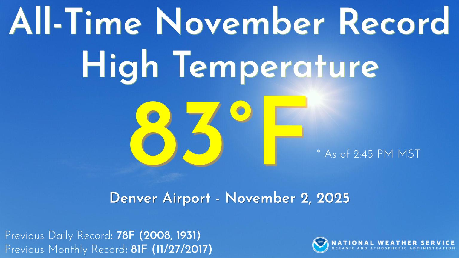 Denver International Airport recorded a temperature of 83 degrees on Sunday, November 2nd. This breaks the all-time monthly record high for the month of November. The previous record was 81F, set on November 27th, 2017.